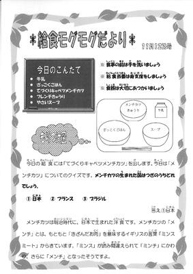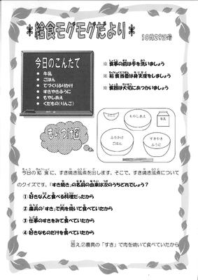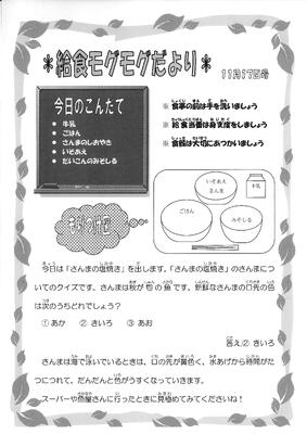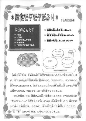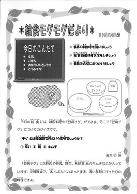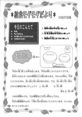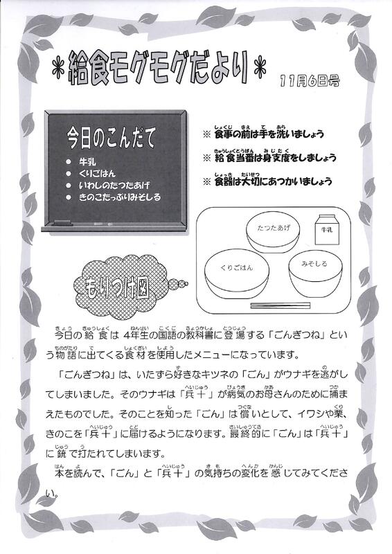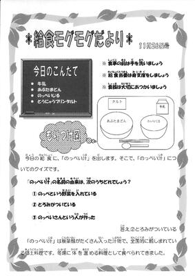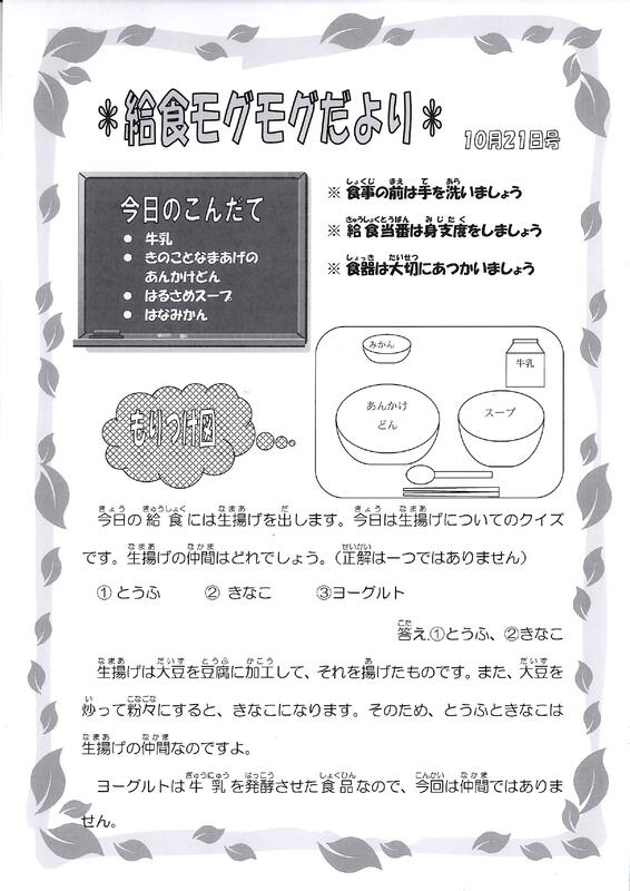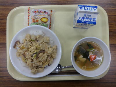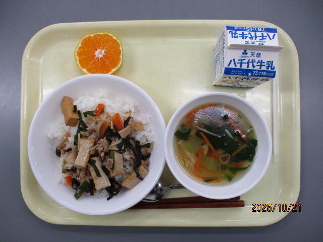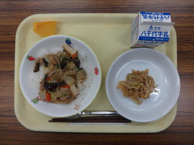 今日の献立は、きのことなまあげのあんかけどん、はるさめスープ、はなみかん、ぎゅうにゅうです。