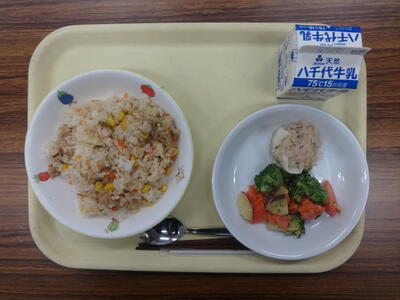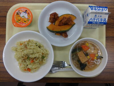 今日の献立は、カレーピラフ、鶏と南瓜のハニーマスタード、野菜スープ、パンプキンババロア、牛乳です。