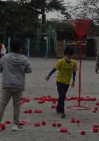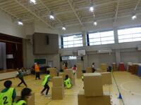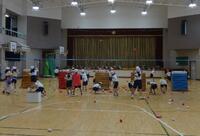 1年生 体育 体育館で、2チーム分かれて、投げるを楽しんでいます。