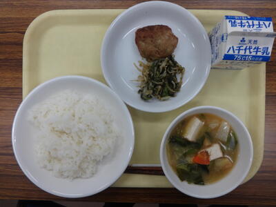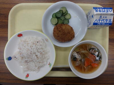 今日の献立は、雑穀ごはん、手作りきゃべつメンチカツ、フレンチきゅうり、野菜スープ、牛乳です。