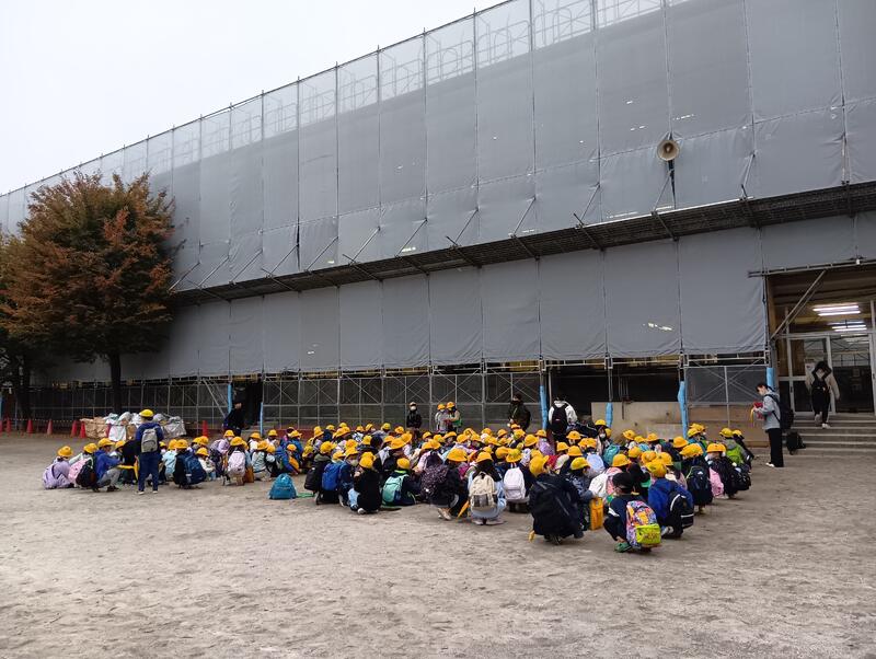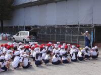 その後、消防局の方に消火器の使い方を教えていただきました。そして、6年代表児童と代表教職員が実際に消火器を噴射する体験をする様子を見学しました。