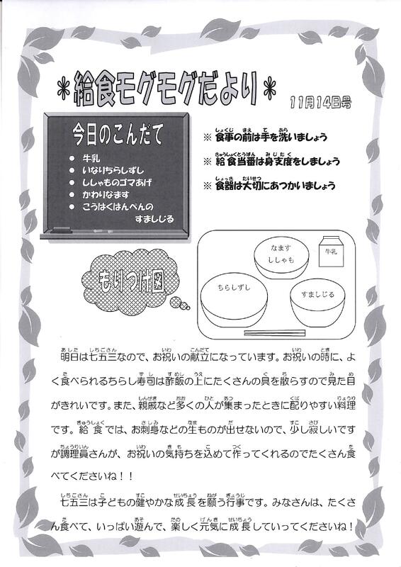 今日の献立は、いなりちらし寿司、ししゃもの胡麻揚げ、変わりなます、紅白はんぺんのすまし汁、牛乳です。