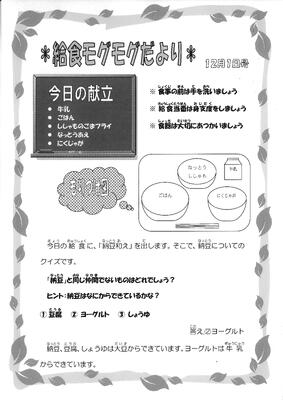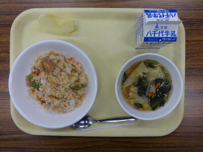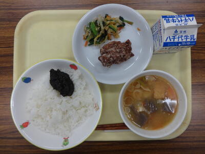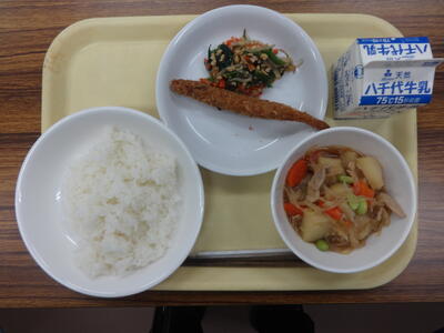 今日の献立は、ハーブ鶏の竜田揚げ、ごはん、行徳海苔の佃煮、小松菜のおひたし、千産千消豚汁、牛乳です。