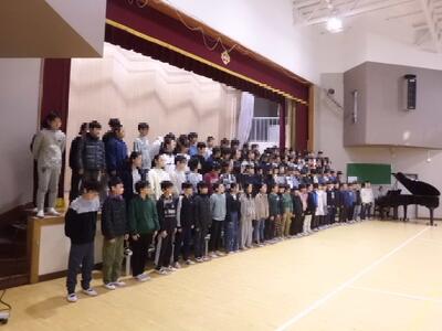 吹奏楽部の伴奏による校歌斉唱 朝から元気いっぱいの歌声が体育館に響き渡りました。
