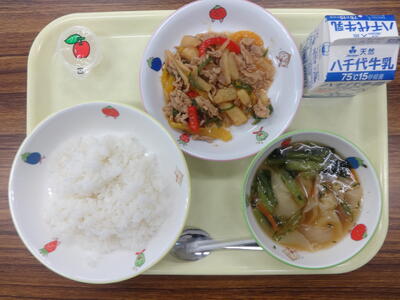 今日の献立は、チンジャオロース、ごはん、ワンタン入り中華スープ、ひとくちゼリー、牛乳です。