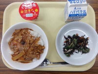 献立は、ポークストロガノフ、ごはん、ひじきのマリネ、ヨーグルト、牛乳でした。