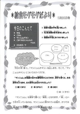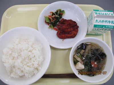 本日の献立は、ヤンニョムチキン、小松菜と人参のナムル、わかめスープ、ごはん、牛乳です。