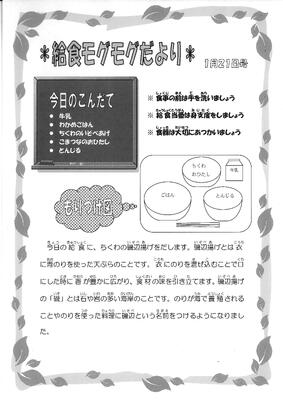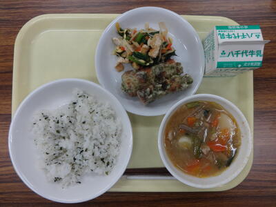 今日の献立は、わかめご飯、ちくわの磯部揚げ、小松菜のおひたし、豚汁、牛乳です。