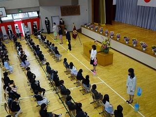 1年生は、「どきどきどん1年生」の曲と2~5年生の拍手に迎えられ、6年生のペアのお友達と入場してきました。