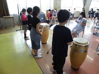 4年生の音楽の授業です。4人の子供たちが「線路は続くよどこまでも」にあわせて打楽器を元気よくたたいていました。
