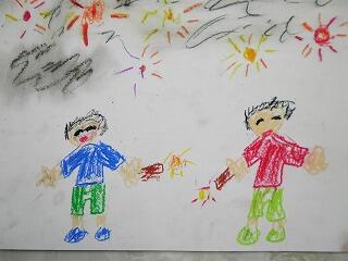 夏の花火です。黒のクレヨンをティッシュでこすって夜の様子を表現しました。