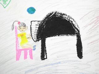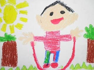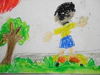 この学習のめあては、大きく2つです。1つは、自分の好きなことを楽しく描くこと。花火、なわとび、ピアノ、水泳など自分の好きなことを思い浮かべながら描いていました。.もう1つのめあては、クレヨンの使い方です。クレヨンは幼稚園や保育園から親しんでいる用具ですが、今回はただ線を引くだけでなく、太さを変えたり色を重ねたりすることに挑戦してみました。