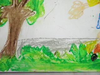 大好きなスケートボードです。草むらをよく見ると、緑のクレヨン一色ではなく黄緑と緑のグラデーションにしています。
