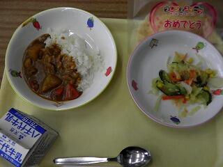 初めての給食は、チキンカレーとコーンサラダ、そして1年生の入学を祝う「お祝いクレープ」メニューでした。