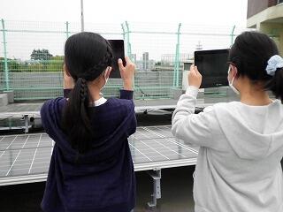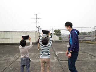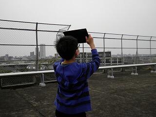 5年生が屋上に出て、タブレットで空の撮影をしています。