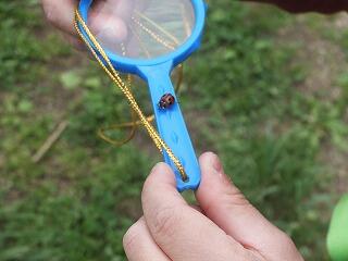 ナナホシテントウだ。テントウムシは先っちょに行くと飛んで行っちゃうんだよ。