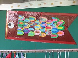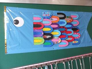 1年生の教室前には、赤と青のこいのぼりが飾られました。よく見ると、うろこが色とりどりです。