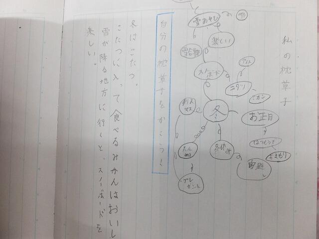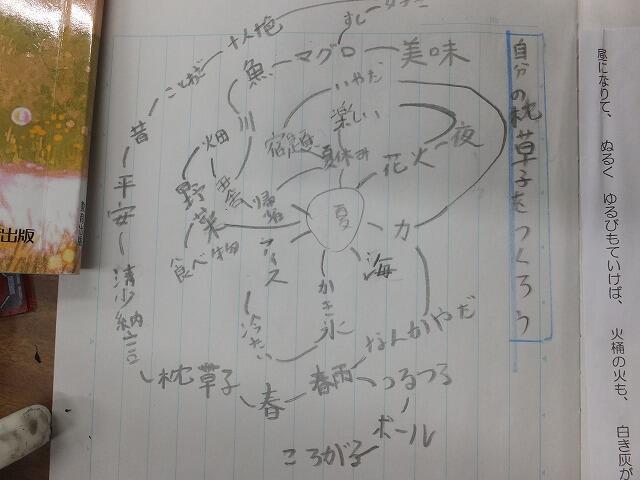 これは、6年生の児童が作った「自分の枕草子」です。それぞれの季節について思いついたものをかき出し、それを文章にしました。これは、これから学習する随筆文につながります。