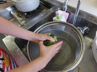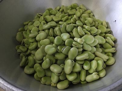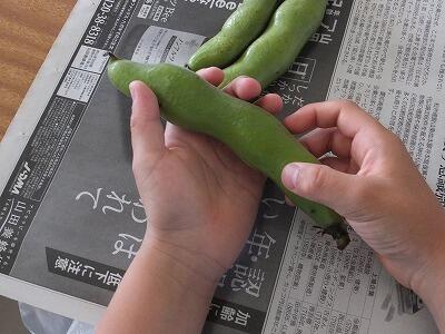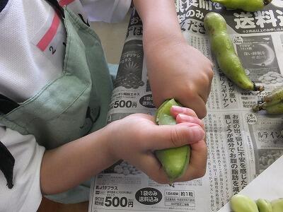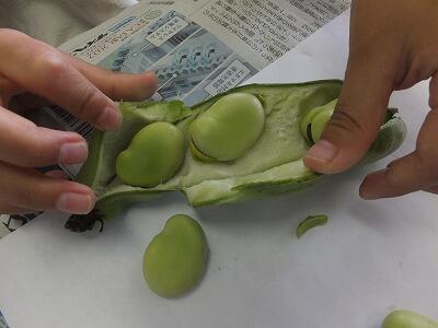 今日は、給食のメニューになっているそら豆皮むきに、1年生が挑戦しました。