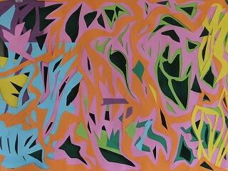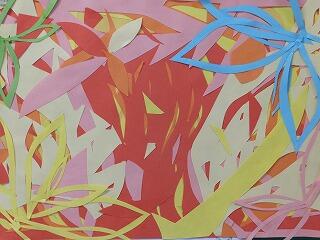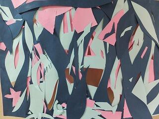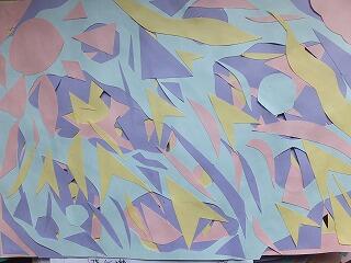 図工で作成した「カット、ペタッと、すてきな形」です。カッターナイフで切り抜いた紙を何枚も重ねているようです。