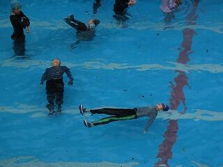 水に流れを作って、その中で浮く練習もしました。川や海には流れがあります。いざという時、自分の命を守るには落ち着いて行動することが大切ですね。