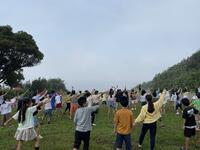 今日は、体育館でキャンプファイヤーの練習です。