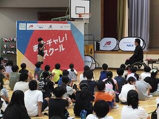 お話の中には、どうして車いす生活になったのか、どのように車いすバスケットに出会ったのかなど、ご自身の体験を聞かせてくださいました。そのお話の中には、これから子どもたちが生きていくための「勇気」がたくさん詰まっていました。