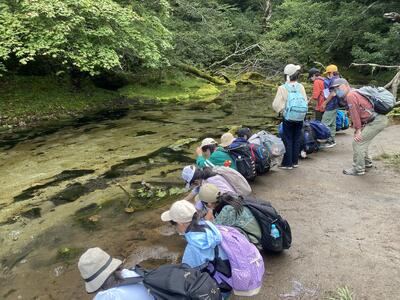 冷たい湧き水に触れてみたり、インタープリターさんに自然の秘密を教えてもらったりしながら、森の中を進みます。