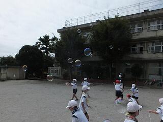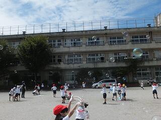 中山小学校の校庭にたくさんのシャボン玉が舞いました。