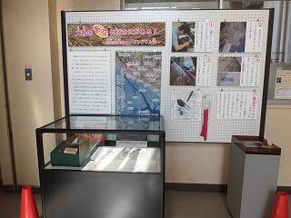 3年生、5年生の昇降口に仮設の展示スペースができました。これは、市川市考古博物館の方々が子どもたちに昔の生活に興味を持ってほしいと考え、各学校に順番に展示をしてくださる「学校巡回展」の展示物です。