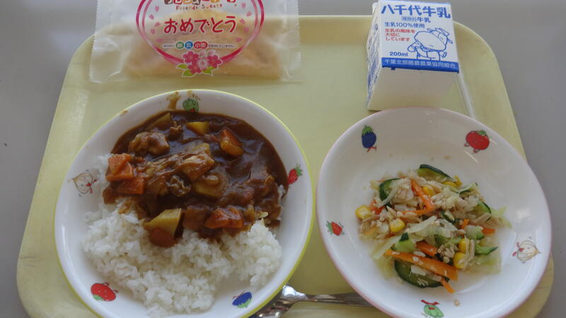4月19日(水)の給食 投稿日時 : 2023/04/19 中山小学校管理者 ごはん チキンカレー ハムサラダ お祝いいちごクレープ 牛乳 今日から1年生の給食がはじまります。あらためて、中山小学校へ入学おめでとうございます。小学校では、いろいろなことを学びますが、給食も学びの時間です。食材のこと、楽しく食べるためのきまりなどをおぼえていきましょう。今日は、中山小でも人気のチキンカレーとクレープで1年生の入学をお祝いします。