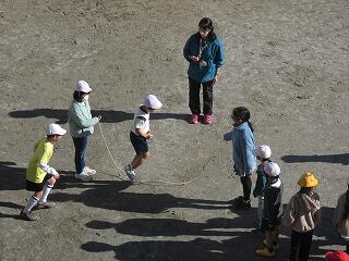 長縄初挑戦の1年生も、最初は、回っている長縄に飛び込むにも苦労していましたが、最近では友だちの掛け声に合わせて入ることができるようになってきました。