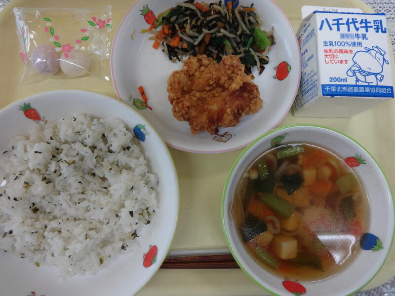 あおなごはん とりのからあげ いそあえ すましじる こうはくだいふく ぎゅうにゅう