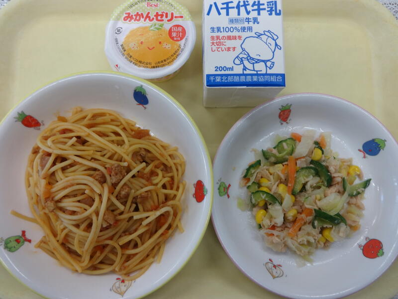 ミートソーススパゲティ ツナサラダ みかんゼリー ぎゅうにゅう
