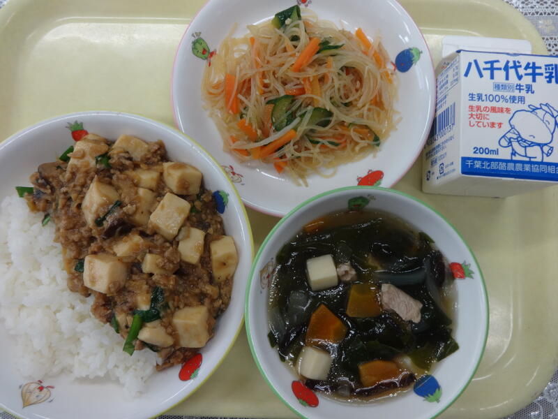 ごはん マーボー豆腐 春雨サラダ わかめスープ 牛乳