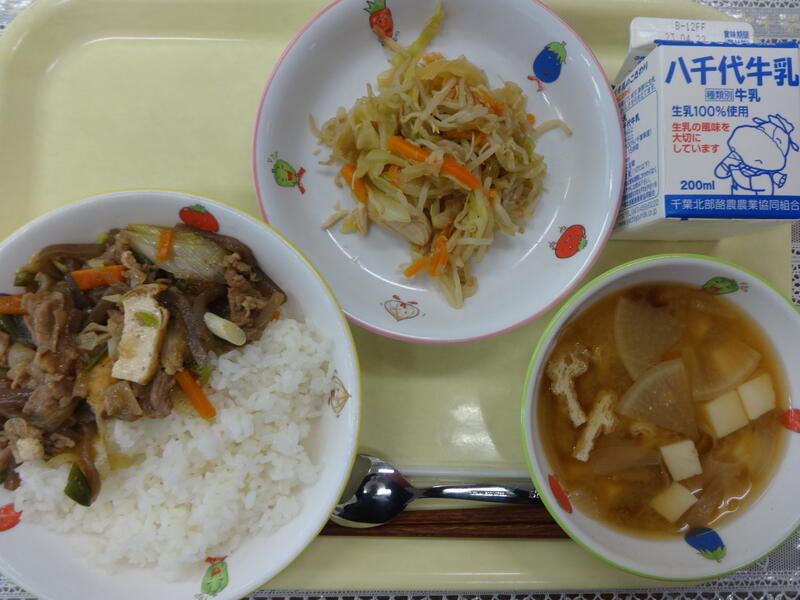 ごはん 豚丼の具 きゃべつとささみあえ なめこのみそ汁 牛乳