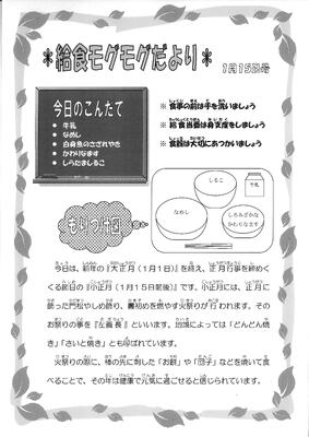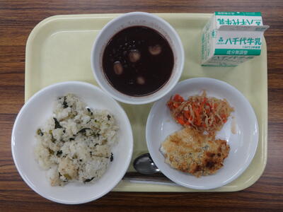 今日の献立は、菜飯、白身魚のさざれ焼き、変わりなます、白玉しるこ、牛乳です。
