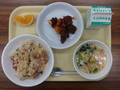 今日の献立は、キムチチャーハン、レバーのマリアナソース、たまごスープ、オレンジ、牛乳です。