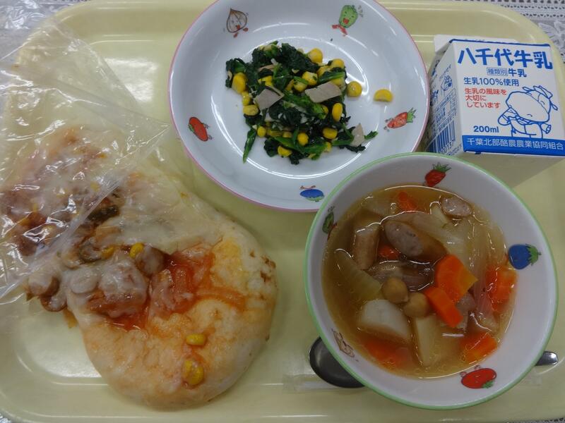 今日はインドのパン「ナン」に、中山小特性のピザソースをのせて焼いた「ナンピザ」です。ウインナー、ベーコン、玉ねぎ、ピーマンが入っています。よくかんで、色々な食材の味や食感を楽しんでください。