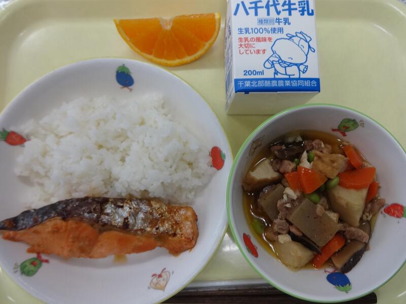 ごはん さけのピリからやき さといもとなまあげのにもの でこぽん 牛乳