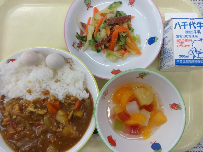 今日の給食は、中山小学校の人気メニュー「中山うずらっ子カレー」です。みなさんは5年生が育てているうずらを見たことがありますか?にわとりよりずっと小さいかわいい鳥です。うずらの卵も小さいですが、栄養はにわとりの卵に負けていません。体の調子をととのえるビタミンが豊富です。教室で2つカレーにのせて食べましょう。