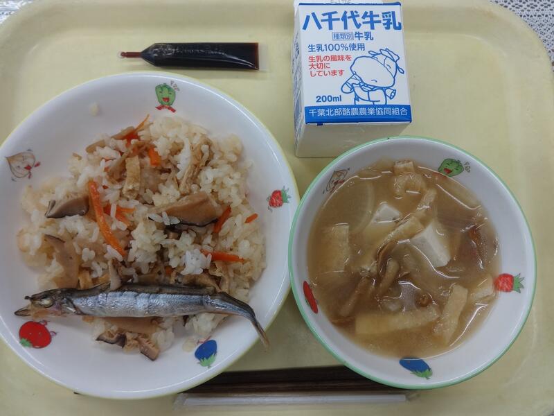 たきこみいなり やきししゃも なめこのみそ汁 牛乳とミルメーク