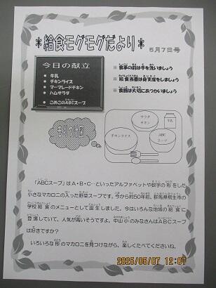 今日の献立は、チキンライス、マーマレードチキン、ハムサラダ、米粉のABCスープ、牛乳です。