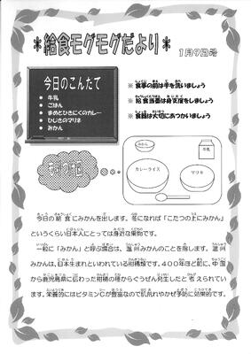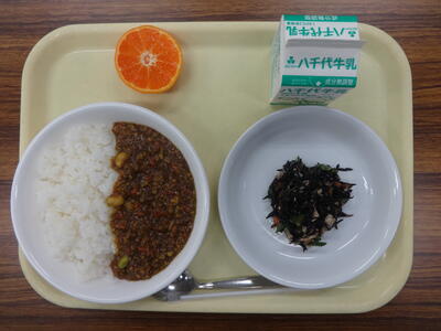 今日の献立は、豆とひき肉のカレーライス、ひじきのマリネ、みかん、牛乳です。