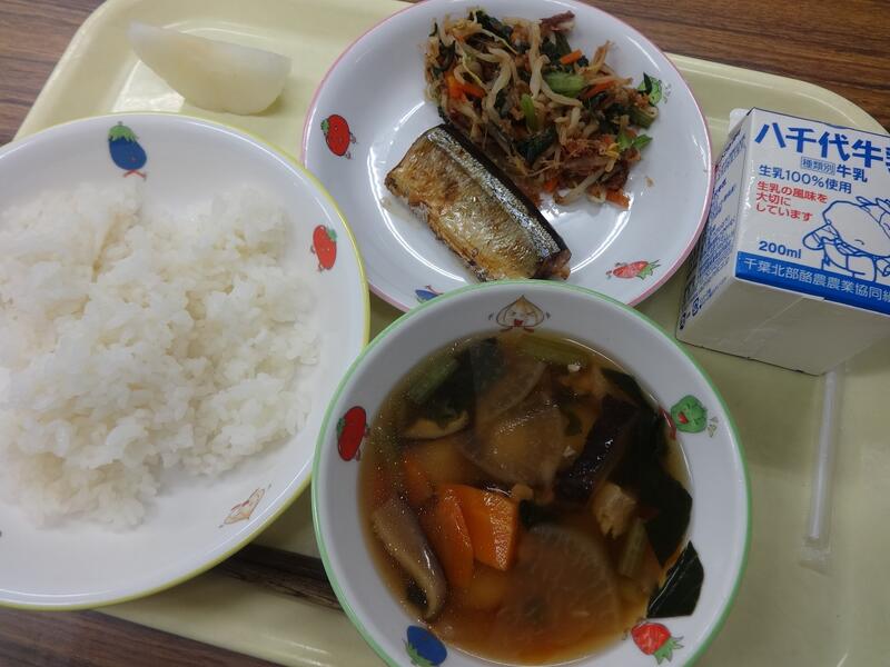 ごはん さんまのしおやき あおなのおかかあえ しらたまのすましじる いちかわのなし ぎゅうにゅう