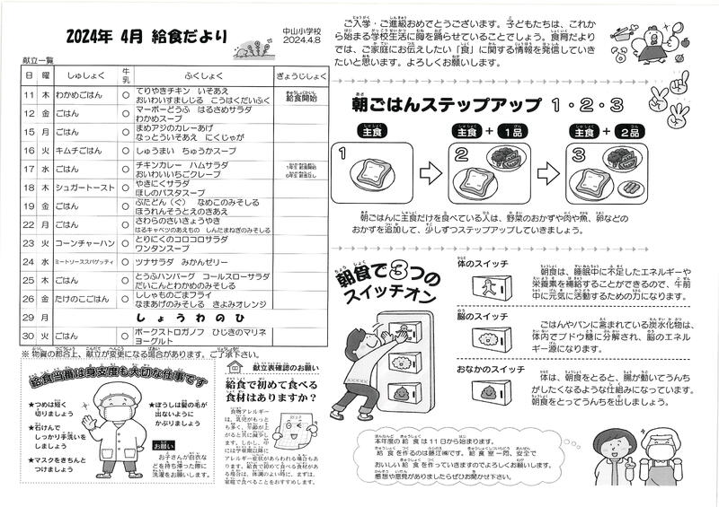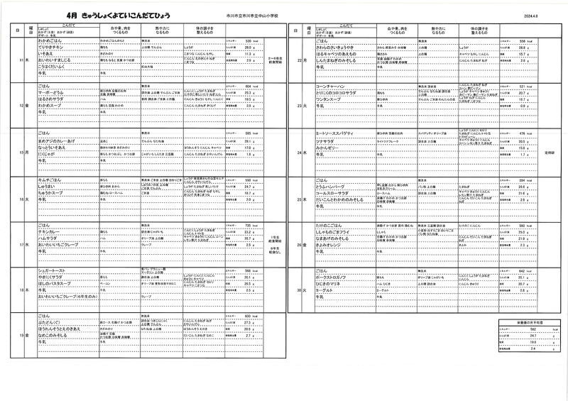 2024年4月の記事一覧 2024年4月 全ての記事 アーカイブ 2025年12月 (0) 2025年11月 (0) 2025年10月 (0) 2025年9月 (0) 2025年8月 (0) 2025年7月 (0) 2025年6月 (0) 2025年5月 (0) 2025年4月 (0) 2025年3月 (1) 2025年2月 (1) 2025年1月 (1) 2024年12月 (1) 2024年11月 (0) 2024年10月 (2) 2024年9月 (2) 2024年8月 (0) 2024年7月 (0) 2024年6月 (1) 2024年5月 (1) 2024年4月 (1) 10件 1件 5件 10件 20件 50件 100件 4月のこんだてひょう 投稿日時 : 2024/04/11 中山小学校管理者