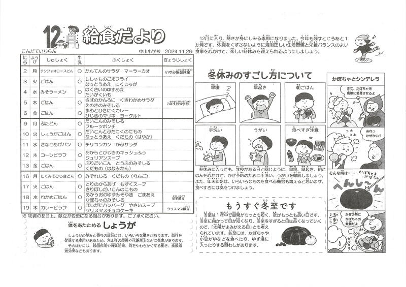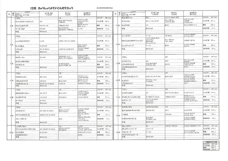 2024年12月の記事一覧 2024年12月 全ての記事 アーカイブ 2025年12月 (0) 2025年11月 (0) 2025年10月 (0) 2025年9月 (0) 2025年8月 (0) 2025年7月 (0) 2025年6月 (0) 2025年5月 (0) 2025年4月 (0) 2025年3月 (1) 2025年2月 (1) 2025年1月 (1) 2024年12月 (1) 2024年11月 (0) 2024年10月 (2) 2024年9月 (2) 2024年8月 (0) 2024年7月 (0) 2024年6月 (1) 2024年5月 (1) 2024年4月 (1) 10件 1件 5件 10件 20件 50件 100件 12月のこんだてひょう 投稿日時 : 2024/12/02 中山小学校管理者