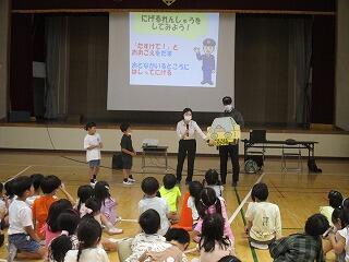 防犯教室 投稿日時 : 2023/06/09 中山小学校管理者 今日は、全校で不審者対応訓練と1年生の防犯教室が行われました。 学校に不審者が入ってきた時に、どのような対応を取ればよいかを教員も児童も確認をしました。 1年生の防犯教室では「いかのおすし」を確認したり、公園や下校中に不審者に連れていかれそうになった時にどう対応すればよいかを教えていただきました。