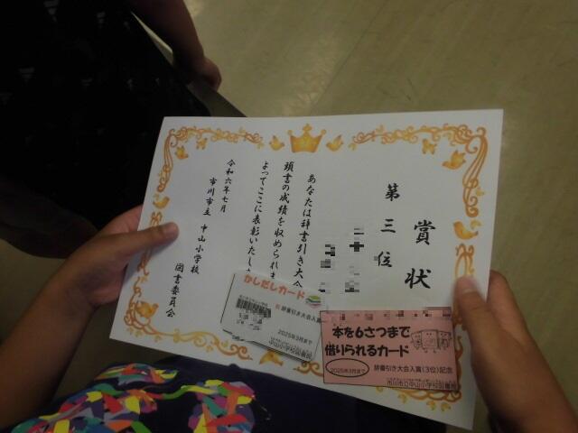 辞書引き大会 表彰 投稿日時 : 2024/07/16 中山小学校管理者 辞書引き大会の表彰式がありました。 3~6年生の1~3位が表彰されました。 賞状だけでなく、図書の貸し出しカードと複数冊借りられるがカードが渡されました。 皆さん本当によく頑張りました。 1位は8冊まで、2位は7冊まで、3位は6冊まで借りられるそうです。