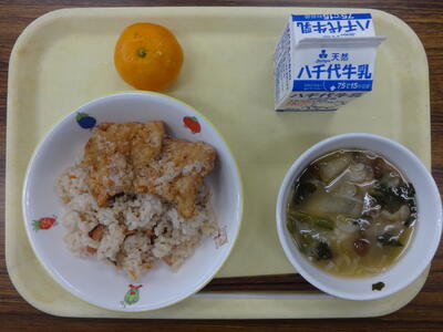今日の献立は、たこめし、鶏の唐揚げ、冬瓜の味噌汁、冷凍みかん、牛乳です。